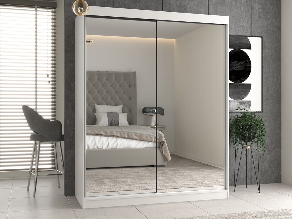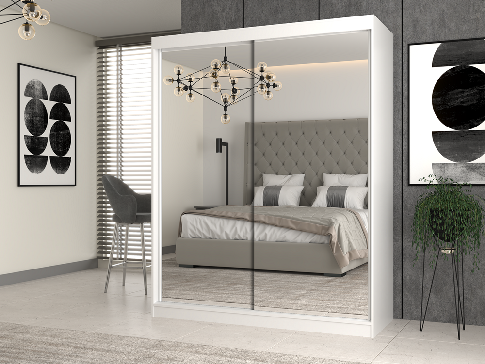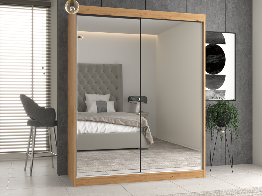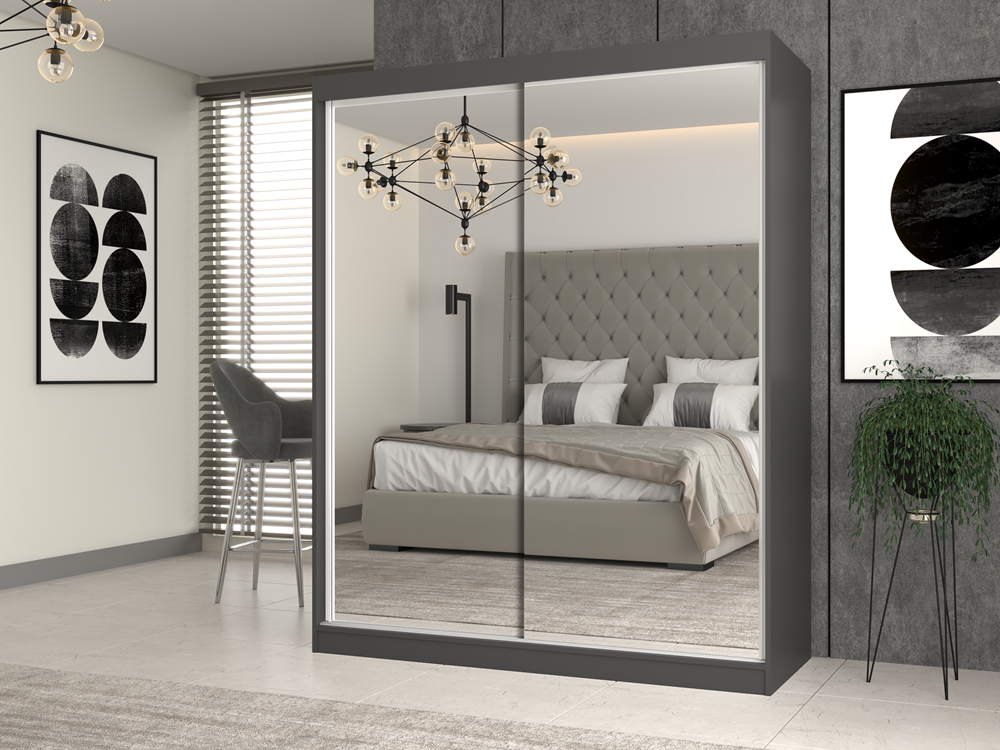 Der Kleiderschrank IGA mit Schiebetüren und Spiegeln ist eine ideale Lösung für die Aufbewahrung der Kleidung im Schlafzimmer und verleiht dem Raum eine geräumige Atmosphäre.