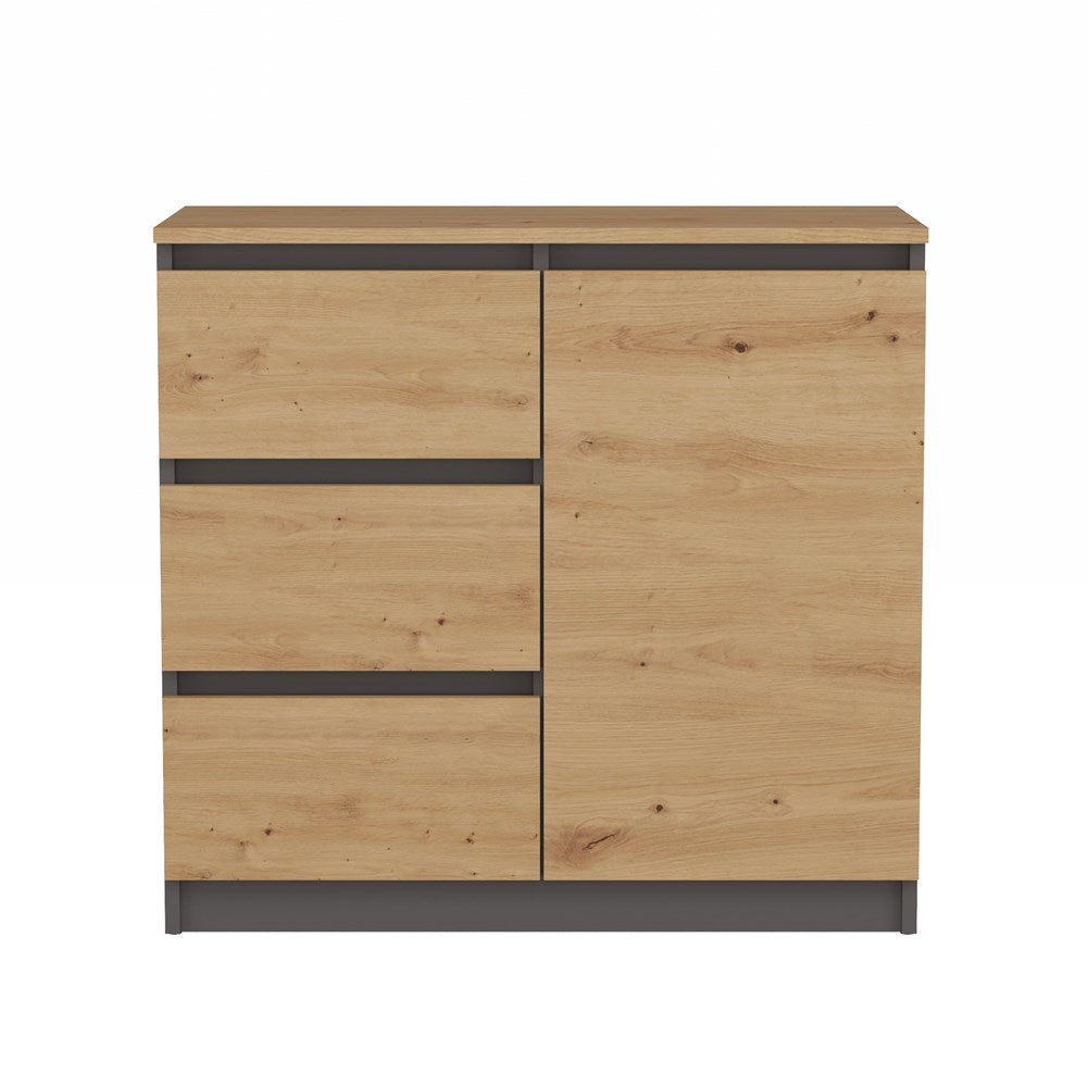 Die moderne Kommode 1D3S ist ein funktionelles und geräumiges Möbelstück, das Ihr Schlaf-, Wohn- oder Kinderzimmer perfekt ausstattet. Das universelle Design erfüllt die Erwartungen aller, die die Kombination von Einfachheit und Eleganz schätzen. Das Innere der Kommode besteht aus Einlegeböden und drei Schubladen. So findet man schnell, was man sucht.